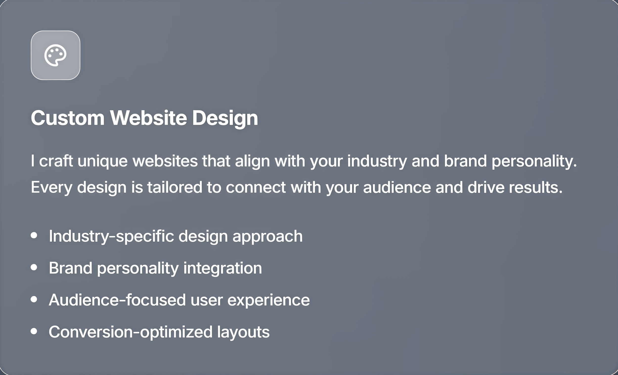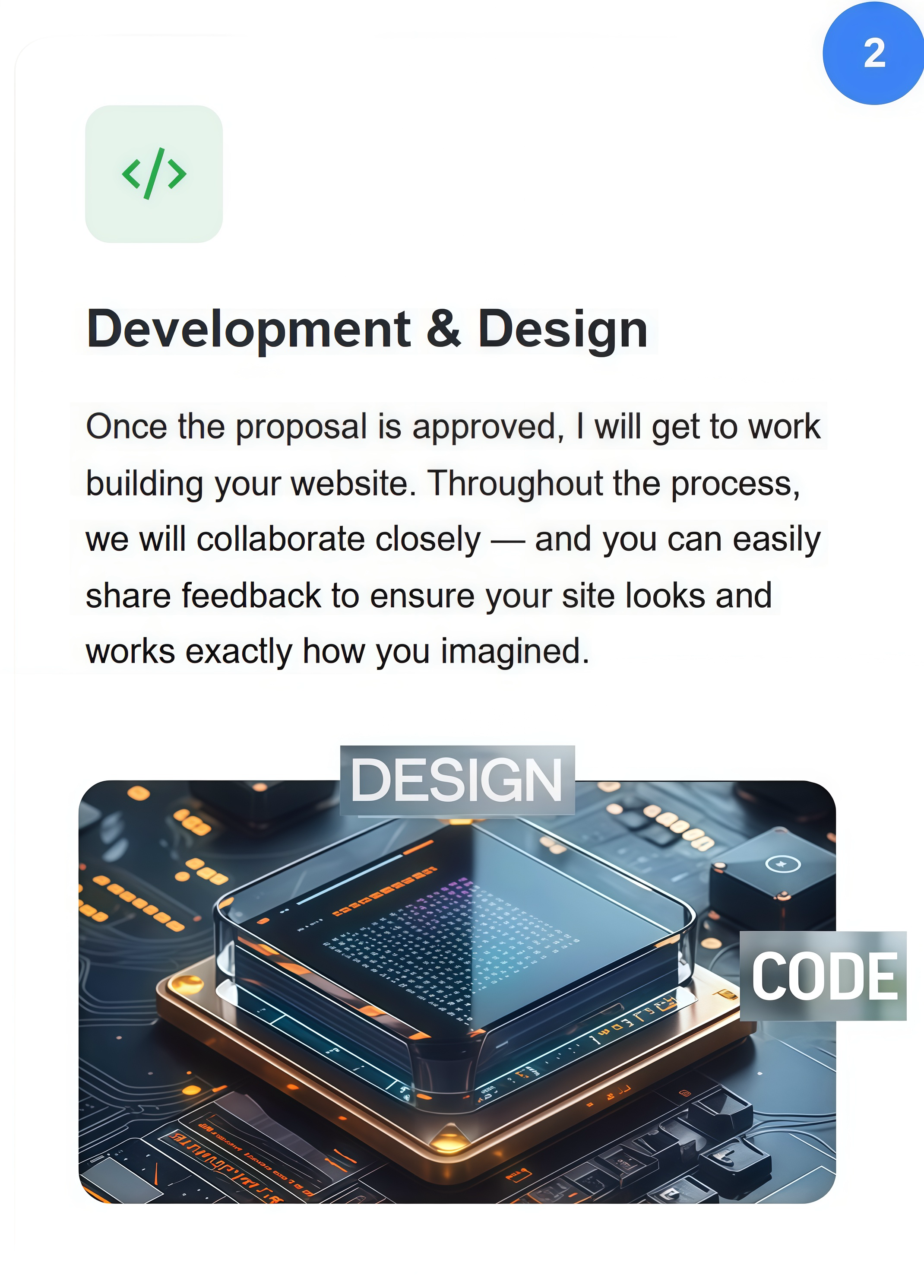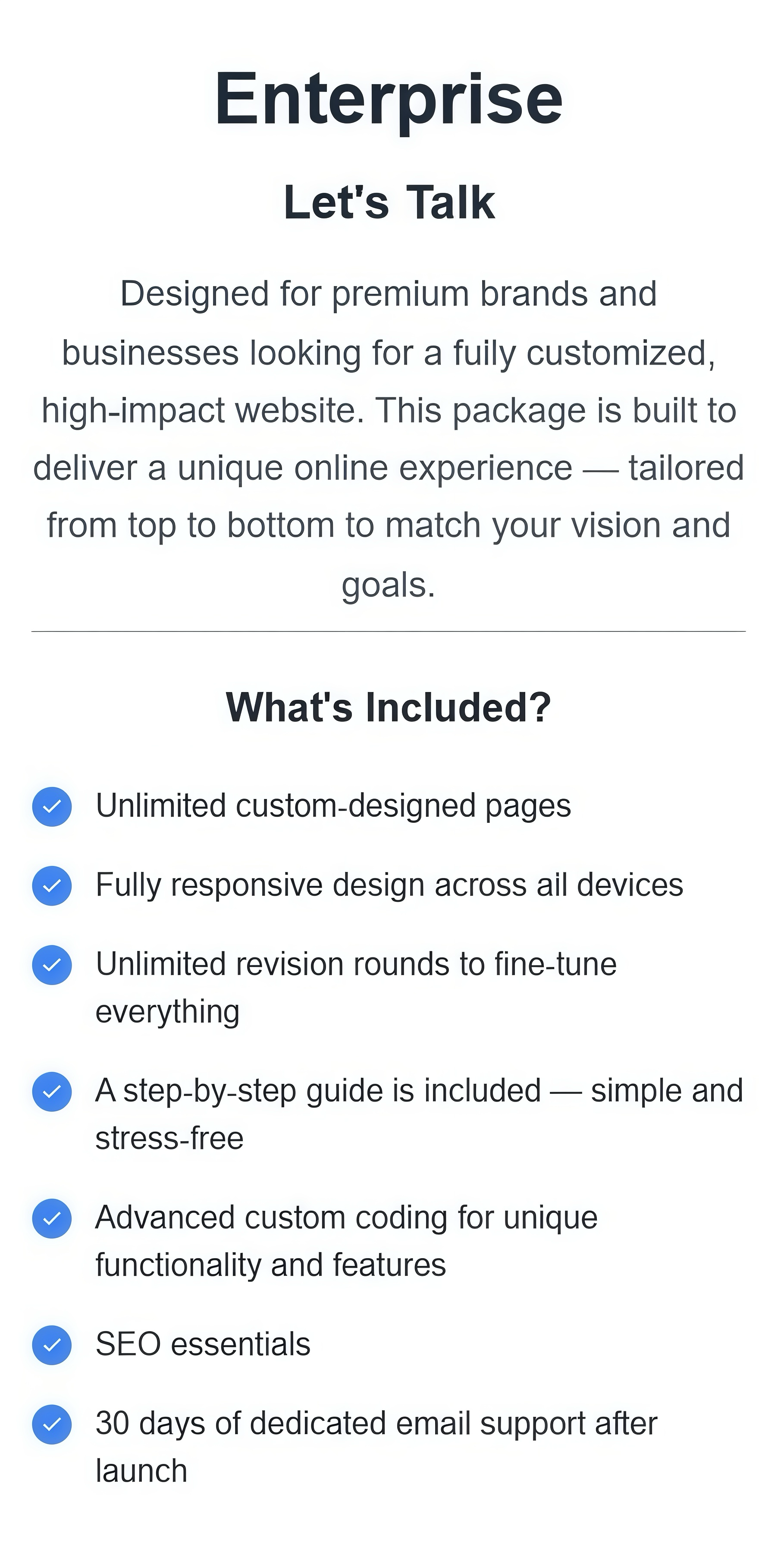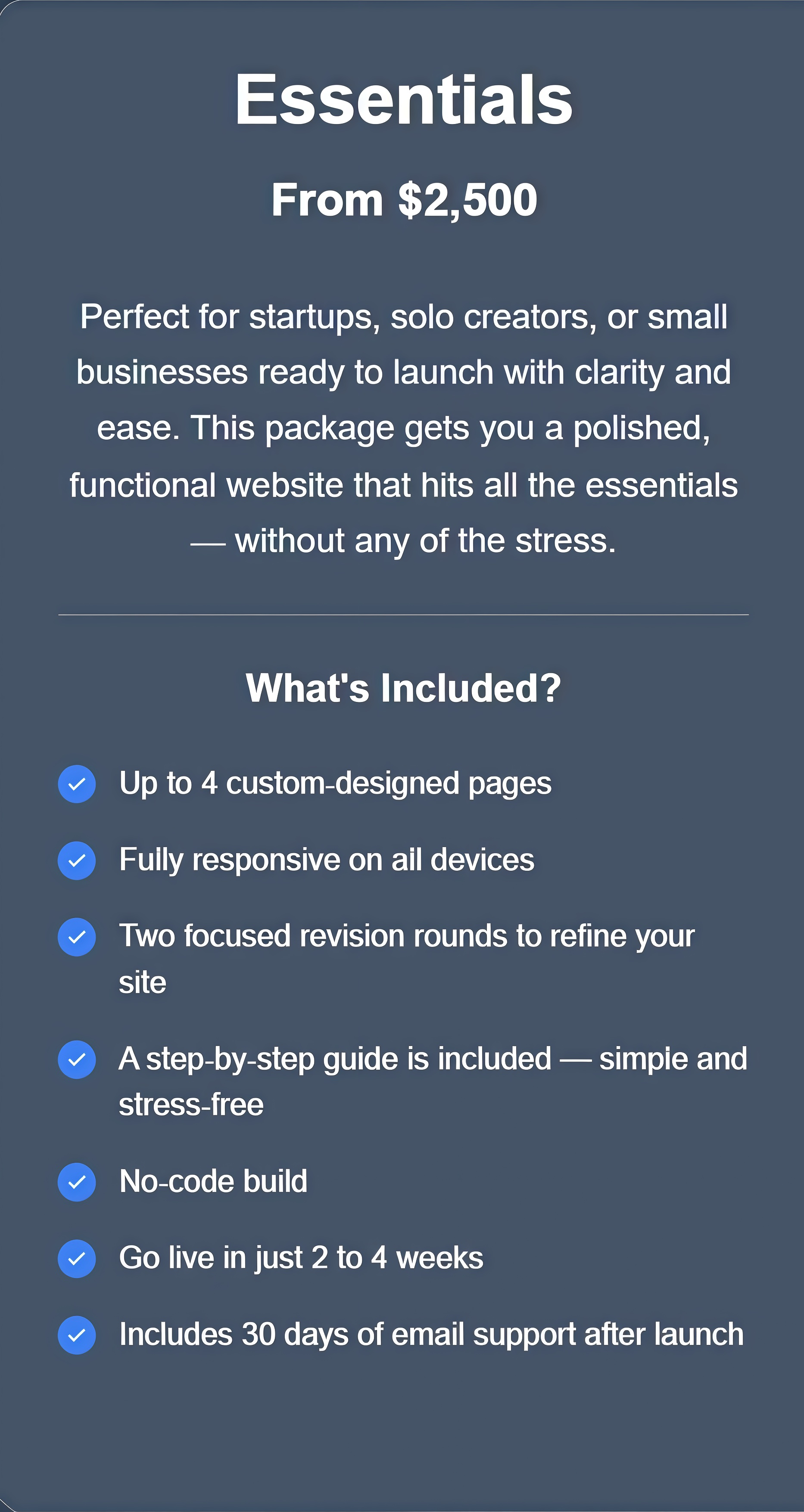 My pricing is transparent from the start — no surprises. Before we begin, you will get a personalized proposal outlining exactly what's included. The result? A strong, polished launch that earns trust, looks great on every screen, and presents your brand.