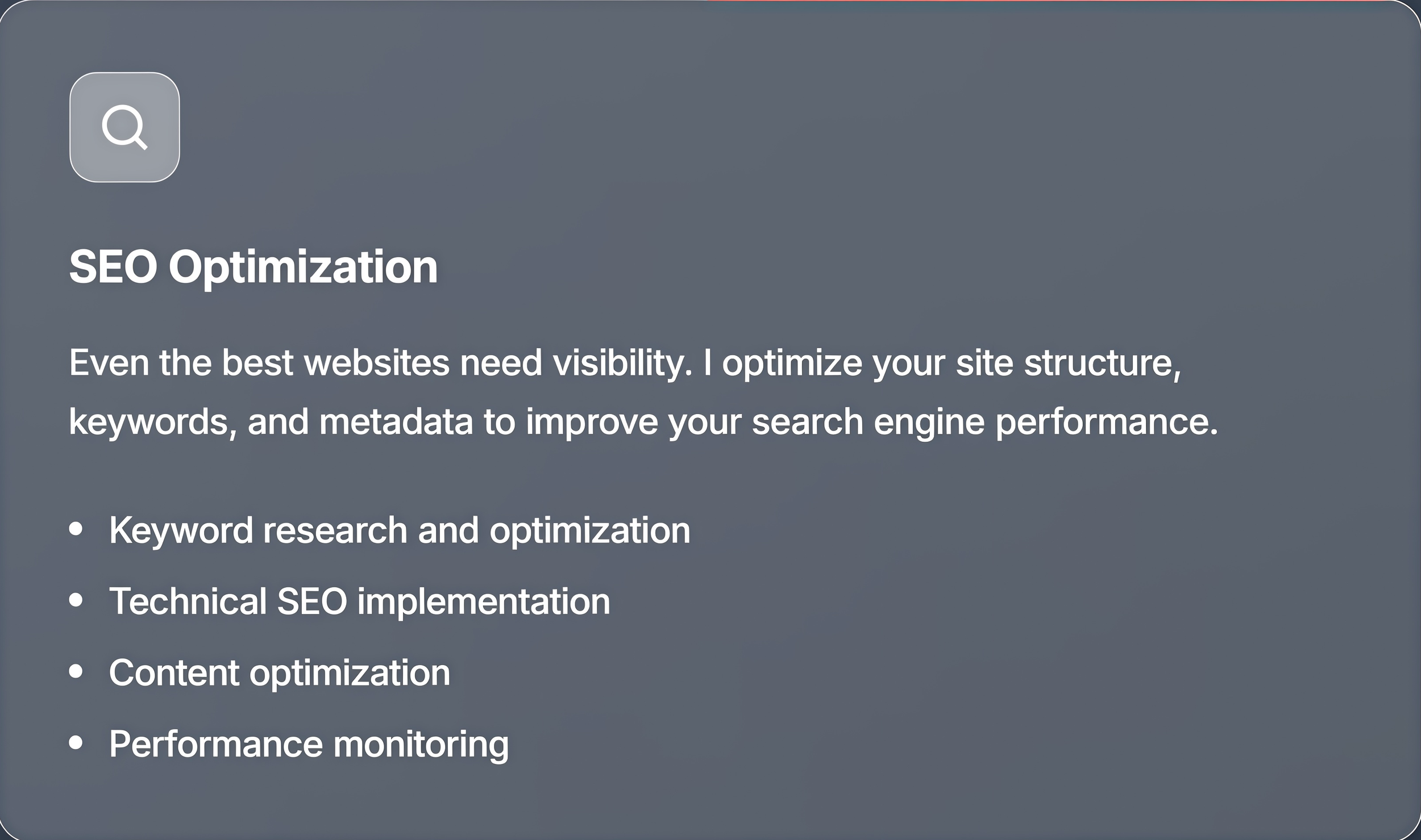 Using Squarespace’s built-in SEO tools, I optimize your site so it can be found more easily on Google — helping more people discover your business online. -