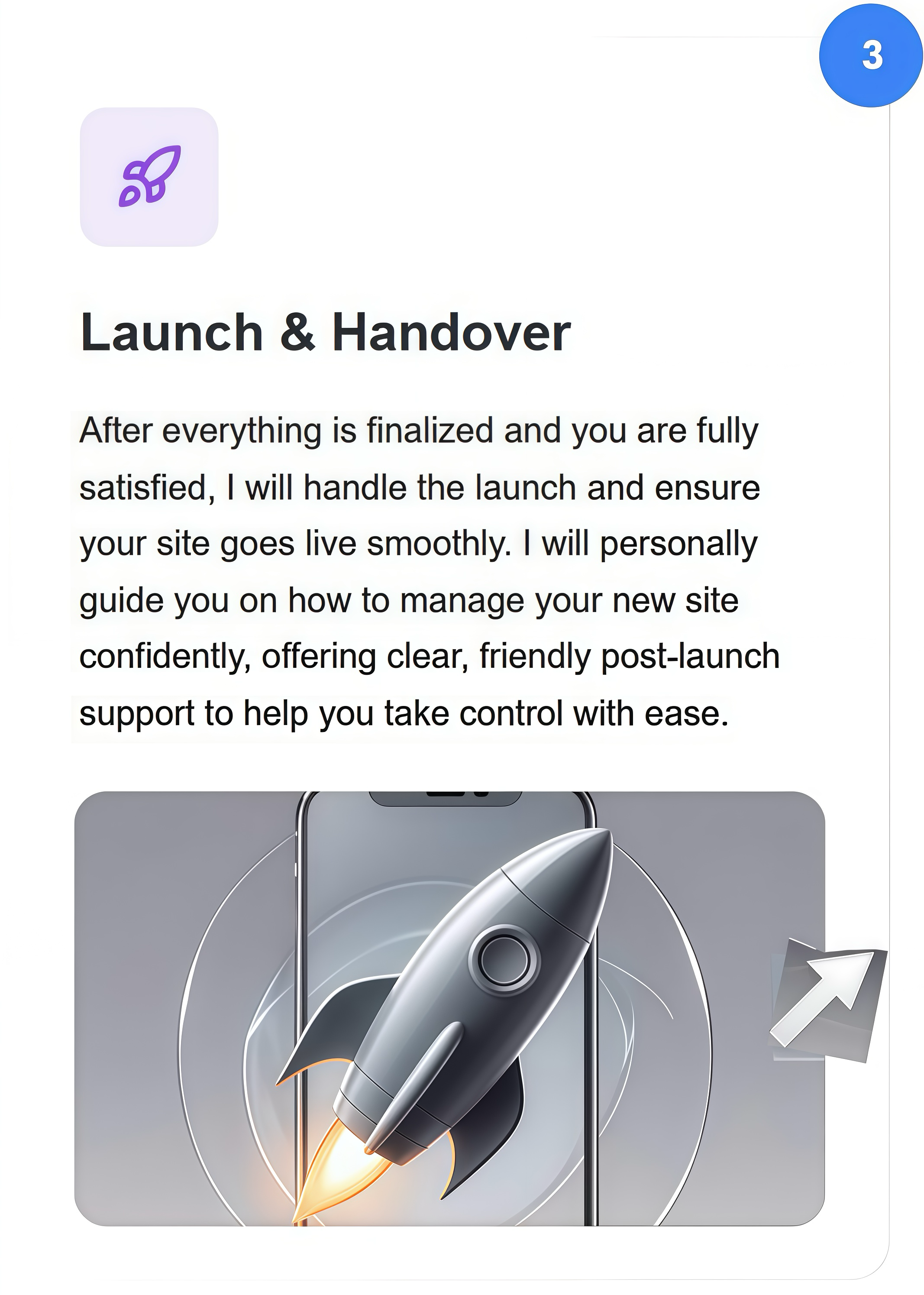 Once everything’s approved and your final payment is done, I’ll get your website ready to go live — and transfer it fully to you.